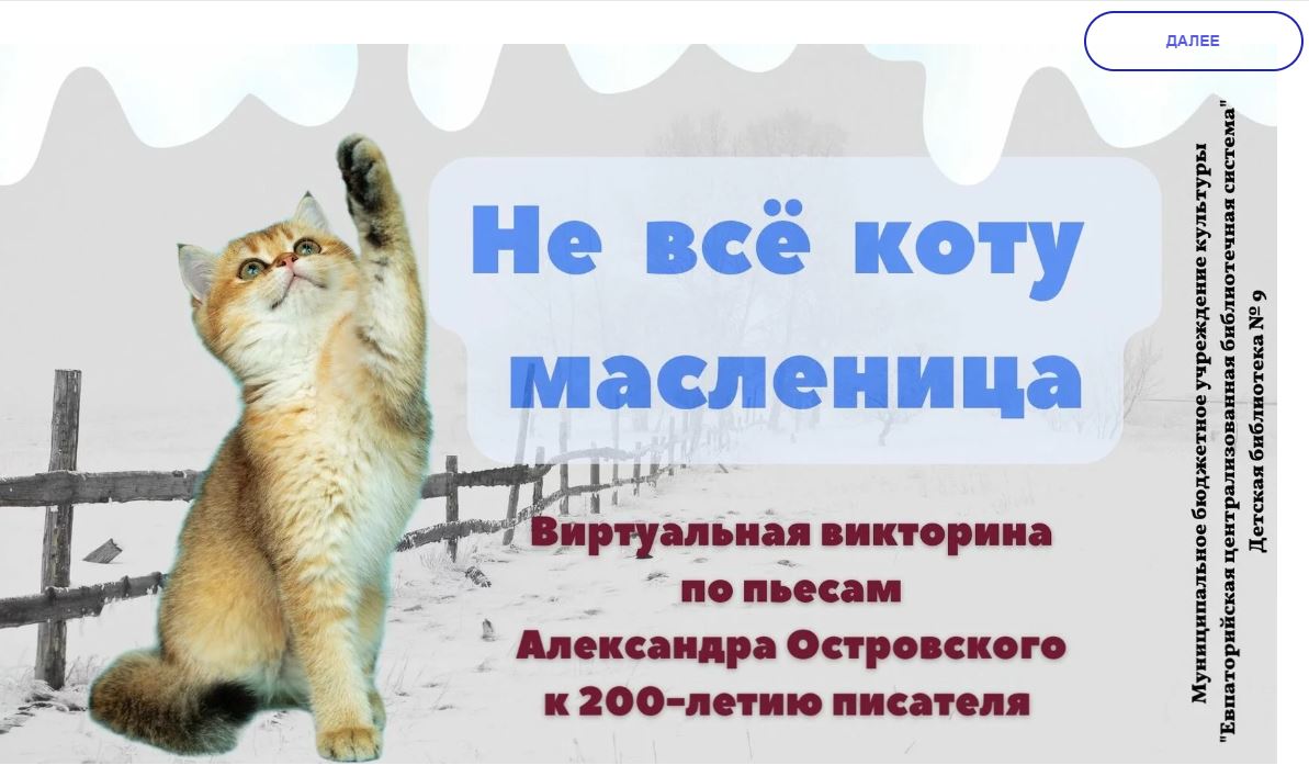 «Только те произведения, писал Островский, пережили века, которые были истинно народными у себя дома; такие произведения со временем делаются понятными и ценными и для других народов, а, наконец, и для всего света». Детская библиотека № 9 предлагает вашему вниманию виртуальную викторину по пьесам писателя юбиляра.