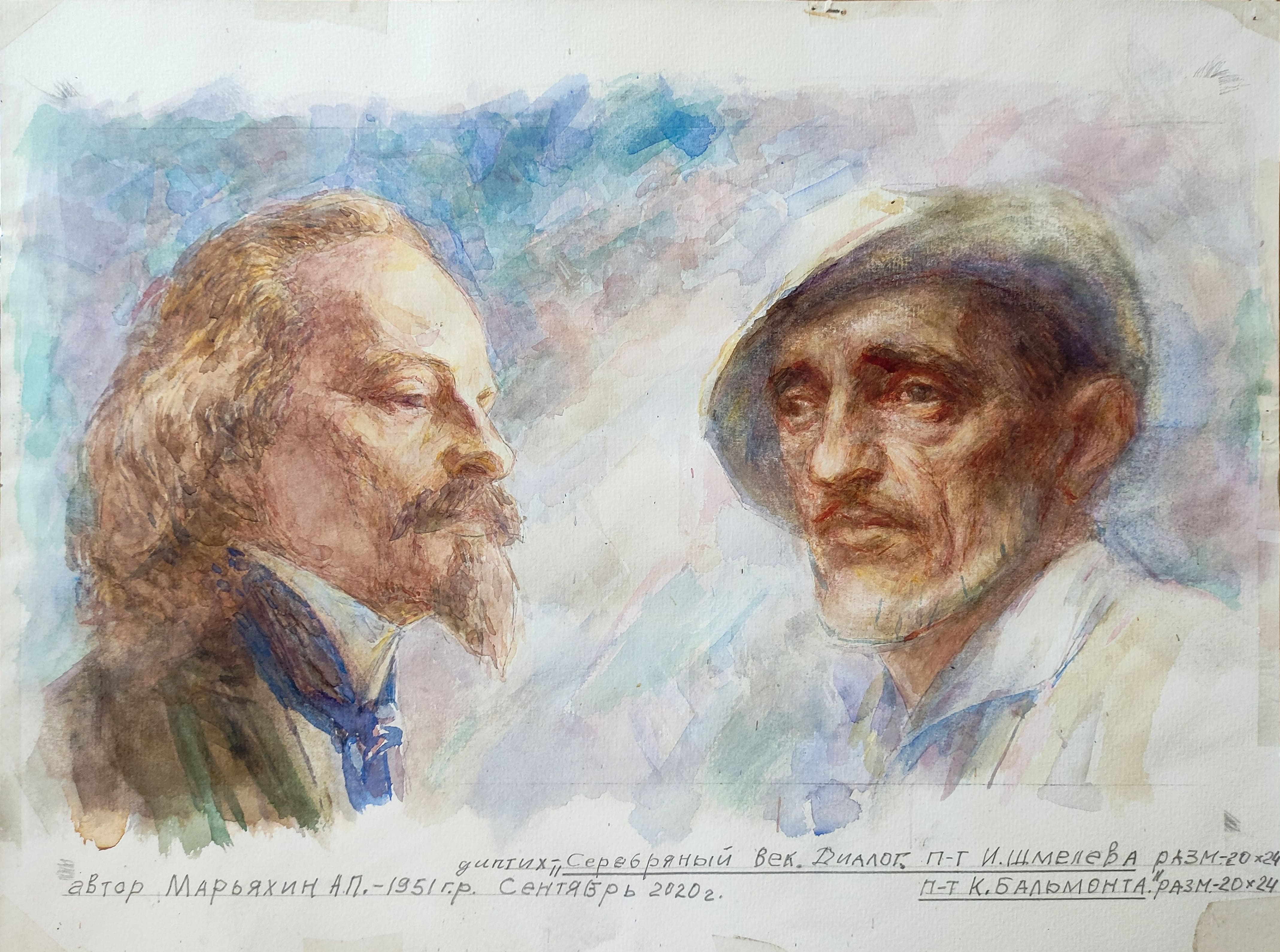 Акварельный диптих «Серебряный век. Диалог» с портретами К. Бальмонта и И. Шмелёва (справа и слева соответственно) поступил в собрание Симферопольского художественного музея в дар от Александра Петровича Марьяхина (р. 1951), дипломанта Биеннале камерной акварели Крыма им. Р.Т. Подуфалого 2020 года, живописца, скульптора, заслуженного художника Крыма.