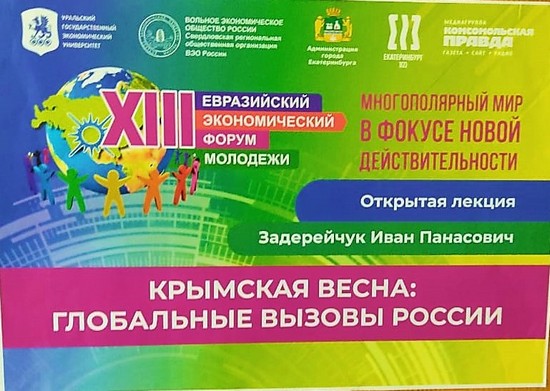 24–28 апреля 2023 года доцент кафедры общегуманитарных и социально-экономических дисциплин Задерейчук И.П. и старший преподаватель кафедры государственно-правовых дисциплин Анкудинова Я.С. Крымского юридического института (филиала) Университета прокуратуры Российской Федерации приняли участие в работе XIII Евразийского экономического форума молодежи «Многополярный мир в фокусе новой действительности», проводимого на базе ФГБОУ ВО «Уральский государственный экономический университет» в г. Екатеринбург.