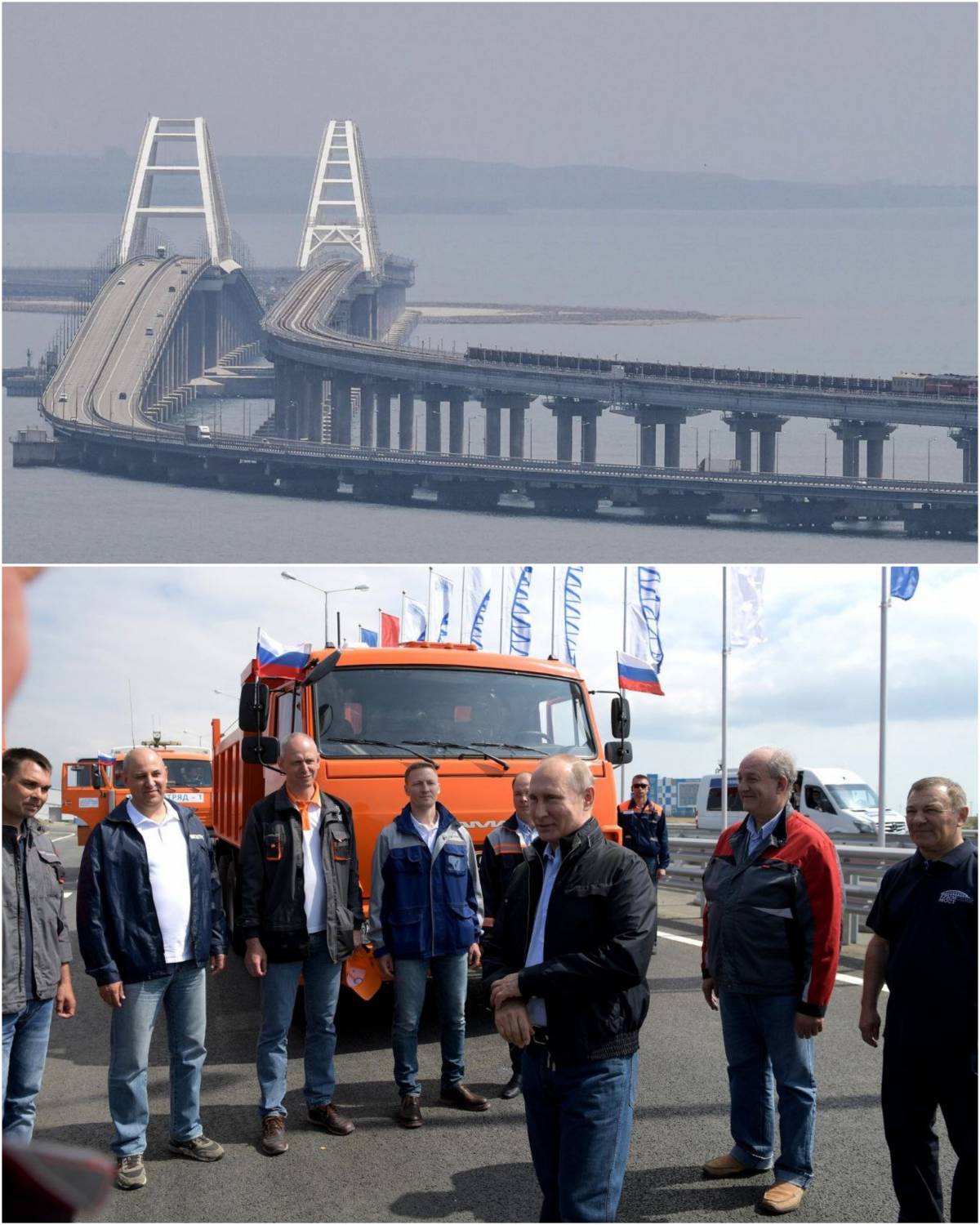 В этот день мост для движения транспорта торжественно открыл Президент России Владимир Путин. Он за рулем "КамАЗа" возглавил автоколонну строительной техники, которая использовалась при возведении объекта, и первым проехал по новому 19-километровому транспортному переходу.