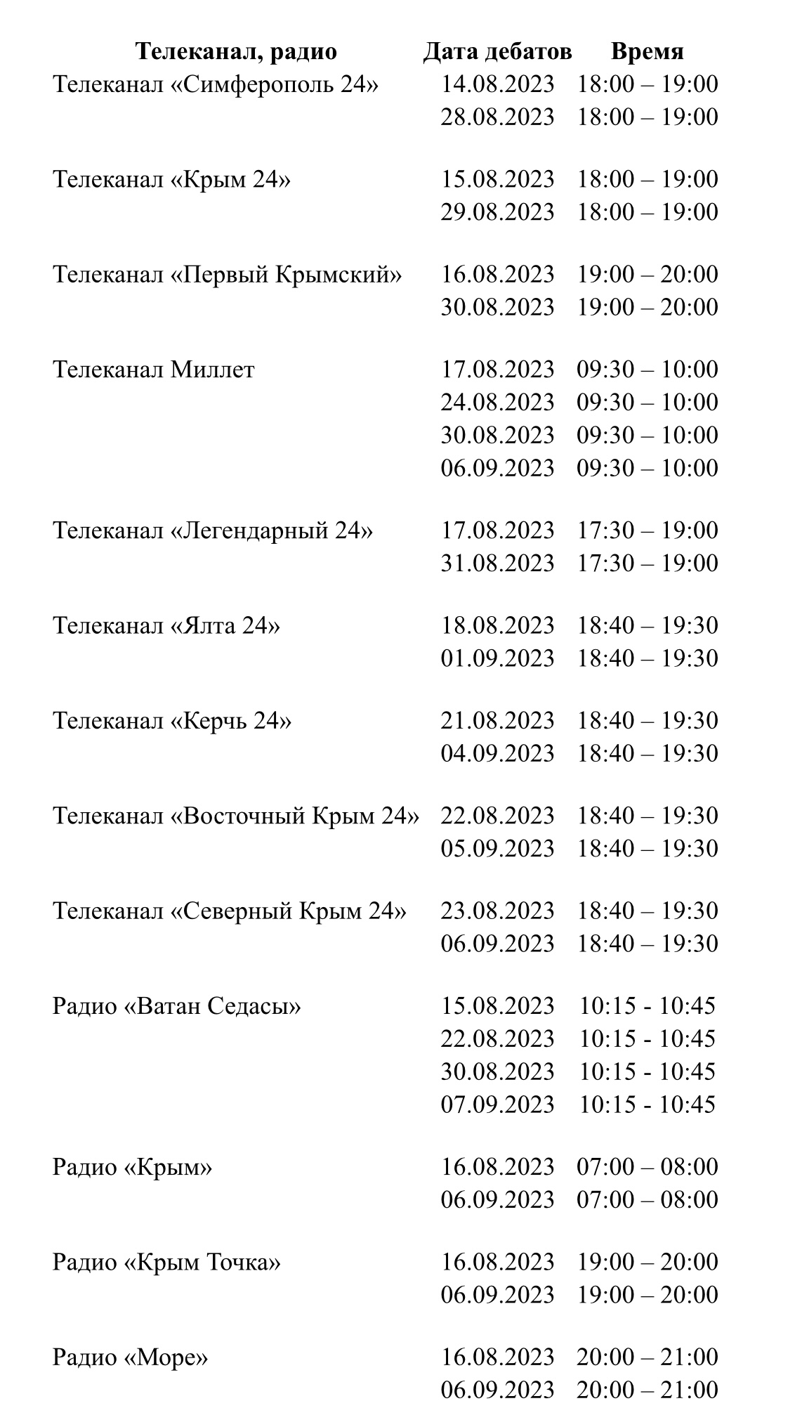 Публикуем расписание предвыборных дебатов на радио и телевидении с участием Кискина Степана Степановича,