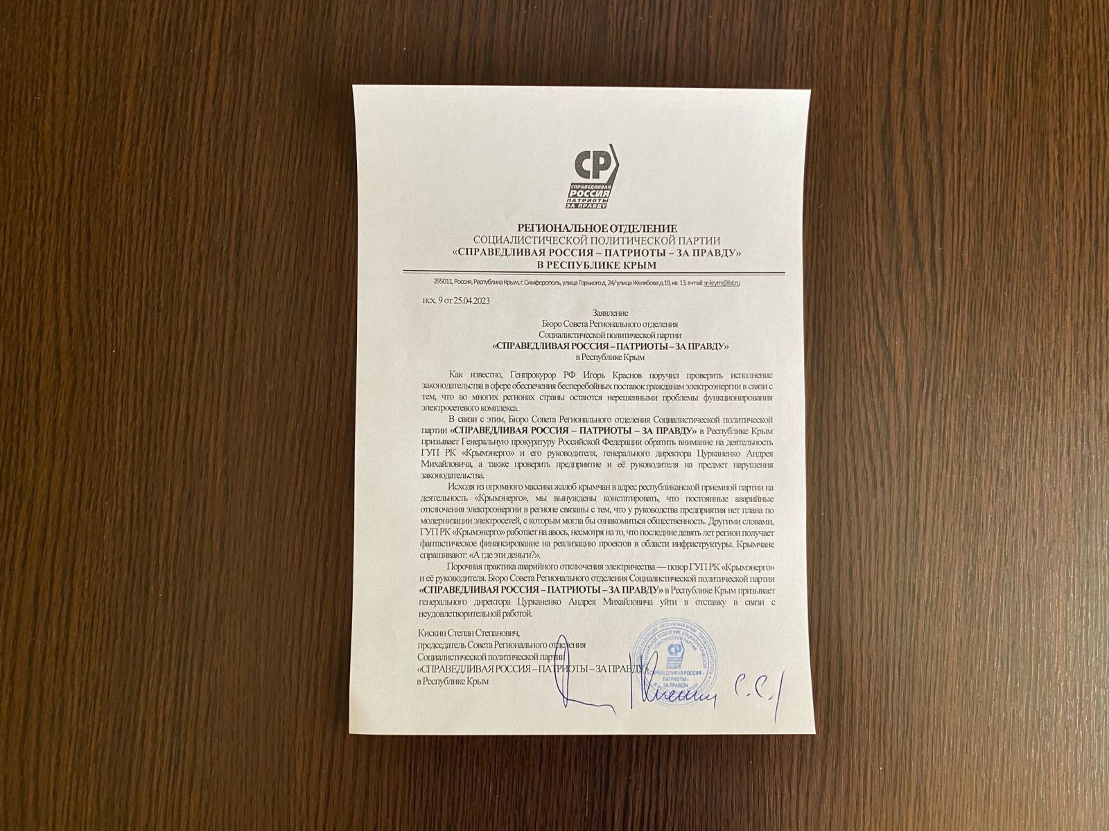 25 апреля 2023 г. Бюро Совета Регионального отделения партии " СПРАВЕДЛИВАЯ РОССИЯ – ЗА ПРАВДУ " в Республике Крым выступило с заявлением по поводу неудовлетворительной работы ГУП РК "Крымэнерго".