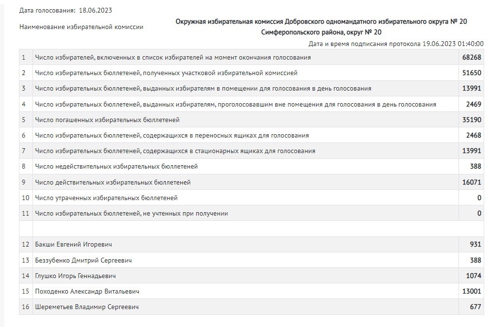 Состоялись довыборы в Государственный Совет Крыма по Добровскому одномандатному избирательному №20. Судя по итоговой таблице голосования, эти выборы не обошли фальсификации.