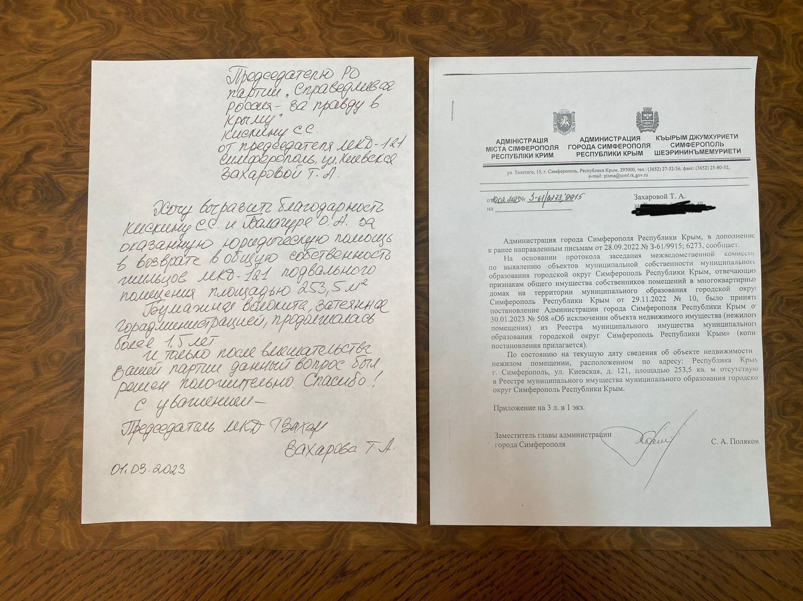 В адрес Регионального отделения партии " СПРАВЕДЛИВАЯ РОССИЯ – ЗА ПРАВДУ " в Крыму поступило обращение от гражданки Захаровой Т.А., в котором она благодарит лидера СРЗП в Республике Крым Степана Кискина и юриста крымского отделения партии Ольгу Балагуру за помощь в возврате в общую собственность жильцов МКД-121 по улице Киевская города Симферополя подвального помещения.