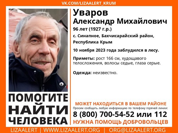 Волонтёры крымского отделения поискового отряда «Лиза Алерт» в Бахчисарайском районе разыскивают 96-летнего Александра Уварова, чьё местонахождение неизвестно с ноября этого года. По предварительным данным мужчина мог заблудиться в лесу.