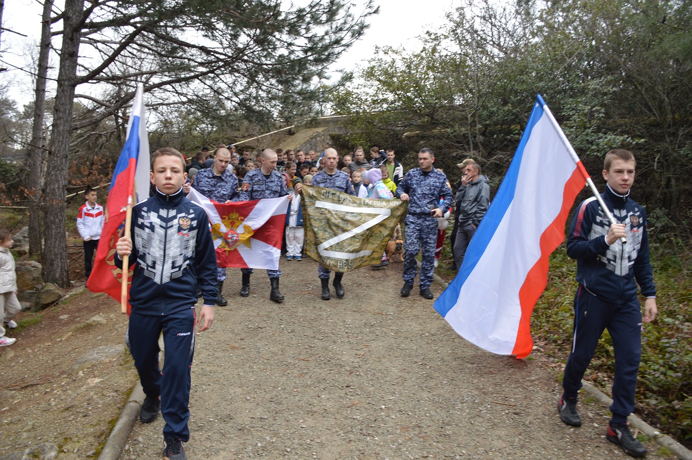 С флагами Российской Федерации и Республики Крым активная и целеустремлённая молодёжь бежала вместе с инициаторами акции - спортивными наставниками Владимиром и Сергеем Рыбальченко, заместителем командира войсковой части 6919 Национальной гвардии Российской Федерации, майором Николаем Турчиным.