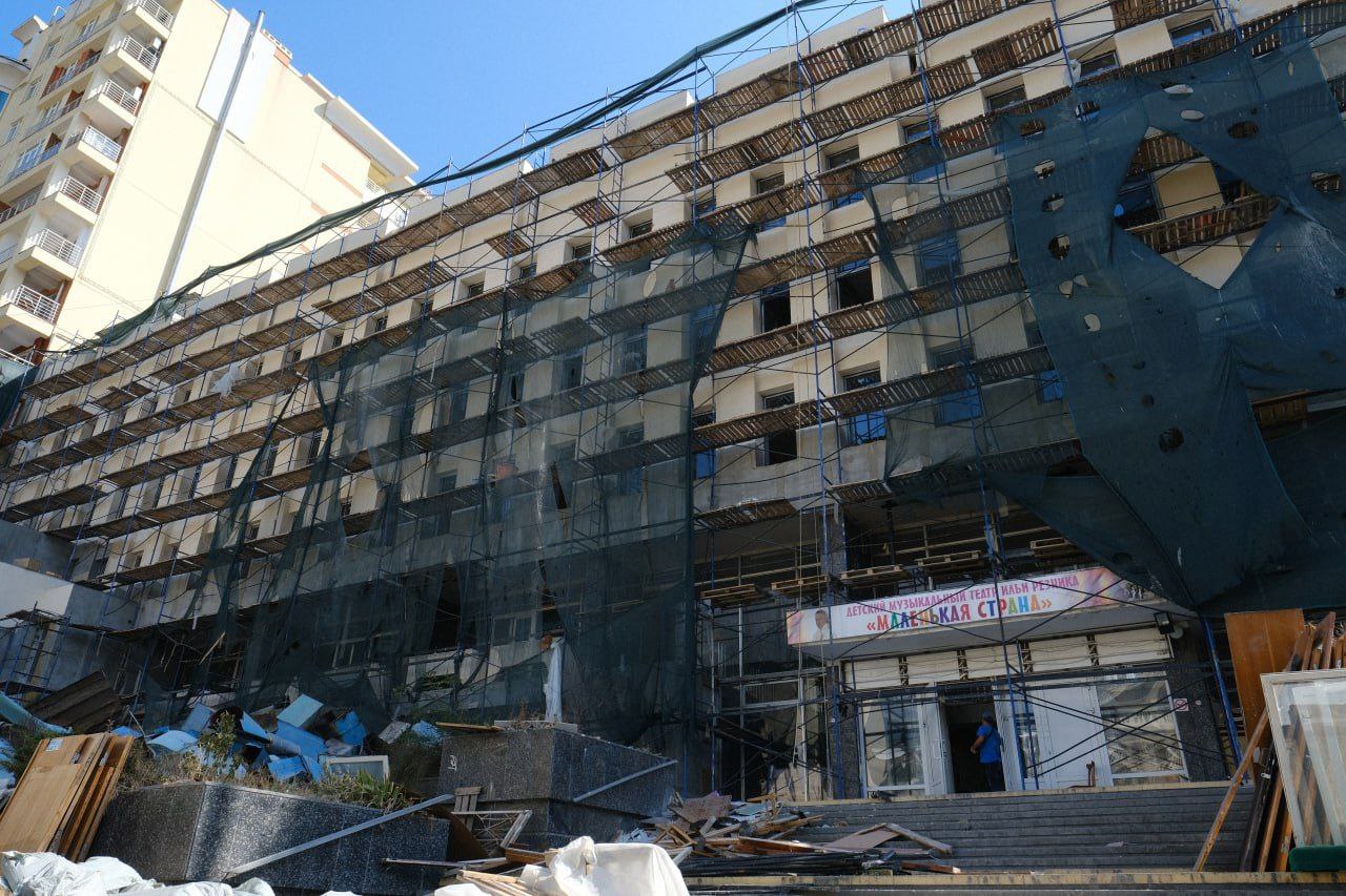 Ремонт охватил 6250 квадратных метров – это три здания разной этажности. Как сообщила глава администрации Ялты Янина Павленко, на 100% завершен демонтаж конструкций, в самом разгаре работы по перепланировке, облицовывается травертином фасад.