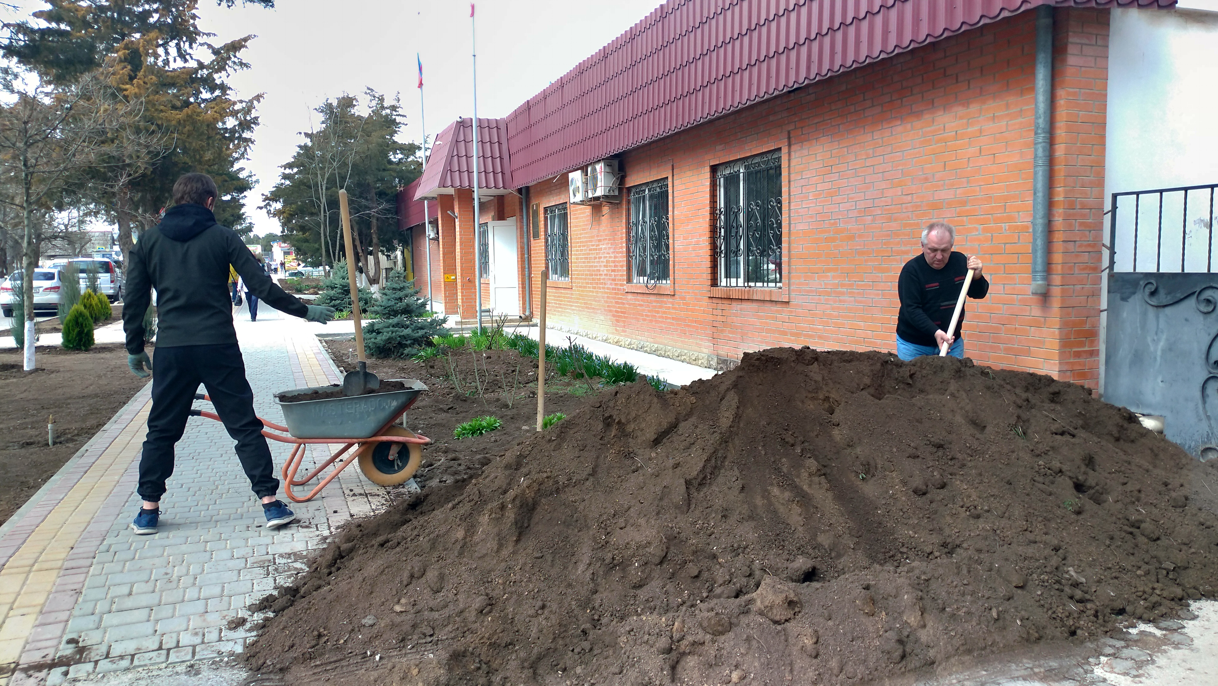 Работники Администрации Красногвардейского сельского поселения и работники МБУ "ОДА ЦКИС "Юность" приняли участие в субботнике Красногвардейского района по ул. Советская 3 и Энгельса(парк)