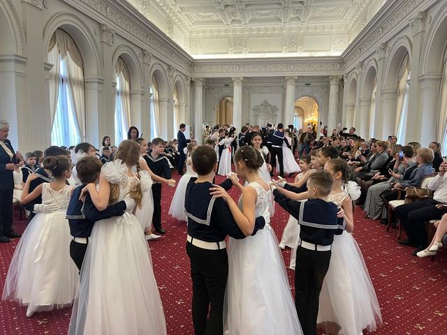 Открывали Морской кадетский бал дебютанты – юнги-первоклассники. Свой первый в жизни бал они ждали с особым трепетом. А украшением мероприятия стал хореографический коллектив «Черноморская жемчужина», три пары которого представляли Детский морской центр на Международном Кремлёвском Кадетском Балу в декабре 2023 года в Москве. Красивые подтянутые юноши в парадной форме и очаровательные девушки в бальных платьях легко и грациозно закружились в танце, погружаясь в эпоху вальсов и кадрилей.