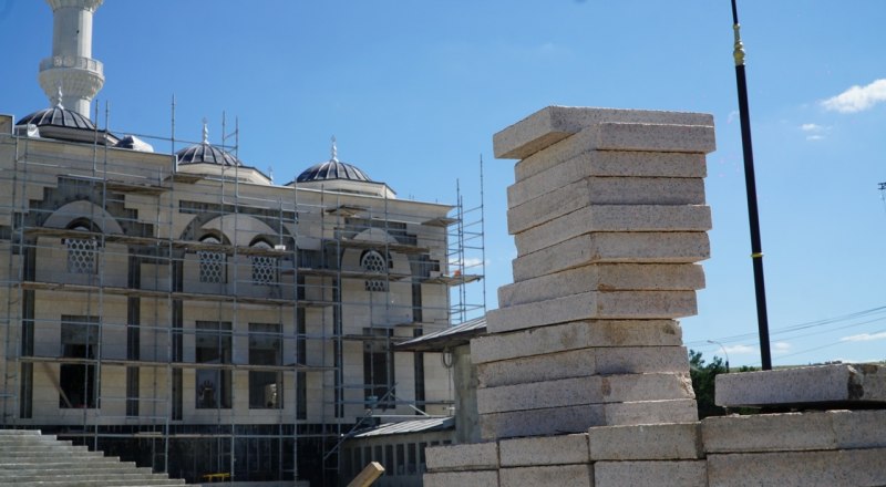 Работа не прекращается также в административном и гостевом корпусах. Здесь тоже идёт внутренняя отделка и благоустройство территории вокруг зданий. Оформление двора религиозного комплекса - один из завершающих этапов обширного фронта работ. Подрядчик укладывает гранитную плитку на центральной площади, устанавливает ливнёвую канализацию, монтирует центральный фонтан. Именно он будет первым объектом, который увидят посетители, попадая во двор комплекса. Чаша в форме звезды оборудована диодной подсветкой, которая будет сочетаться с архитектурной подсветкой на здании мечети.