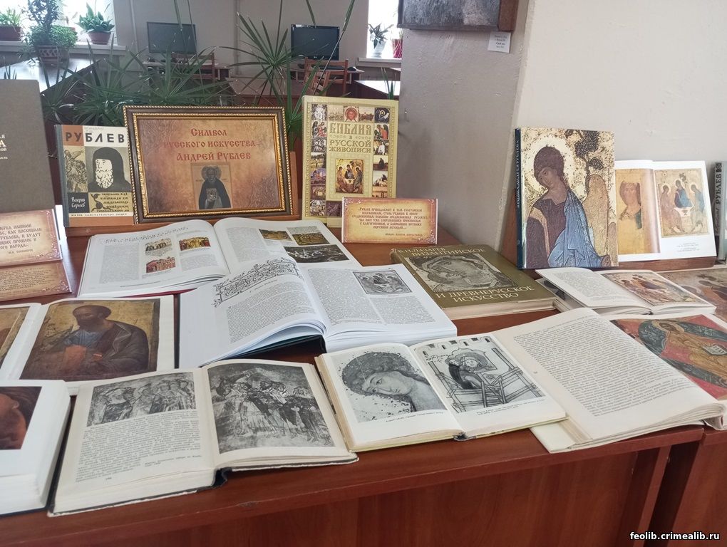 На книжной выставке представлена литература из фонда читального зала библиотеки. Монография В. Н. Лазарева «Андрей Рублев и его школа» наиболее полно охватывает творчество мастера. Антология «Троица Андрея Рублева» включает отрывки из самых известных работ русских и советских ученых о рублевской «Троице». Книгу украшают цветные фотографии иконы, сделанные в Третьяковской галерее специально для данного издания. «Атлас православной иконы» – энциклопедическое издание, из которого читатель узнает об истории иконописания от Древней Руси до наших дней. Издание богато иллюстрировано. В книге писателя и искусствоведа Валерия Сергеева «Андрей Рублёв» из серии «Жизнь замечательных людей» рассказывается о жизненном и творческом пути великого русского иконописца.