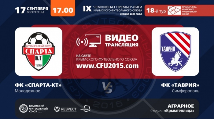 Симферопольская "Таврия" в воскресенье, 17 сентября, проведёт выездной поединок в рамках 18-го тура Премьер-лиги Крымского футбольного союза против "Спарты-КТ" (Молодёжное). Игра состоится на стадионе "Крымтеплица" (Аграрное, Симферополь). Начало матча в 17 часов.