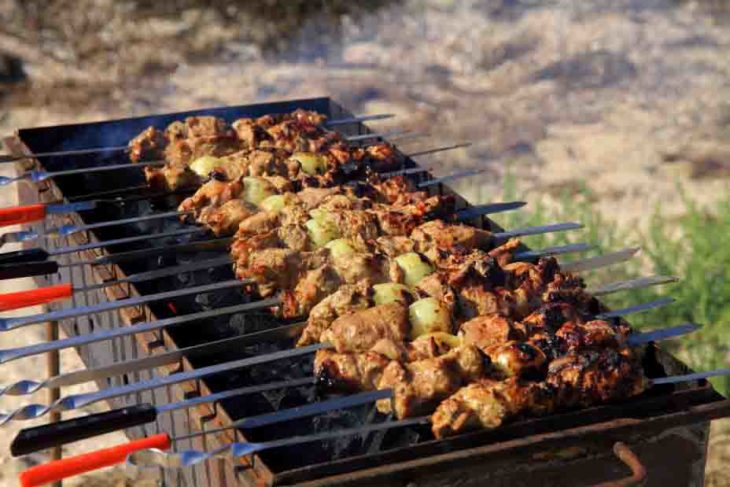 Практически ни один пикник не обходится без приготовления мяса или птицы (чаще всего курицы). Мясо и птицу используют для приготовления шашлыка. Также принято готовить шашлык из рыбы. Мясо для шашлыка следует покупать накануне самого праздника. Помните, что мясо обязательно должно быть свежим. Если вы хотите заготавливать полуфабрикаты для шашлыка — мариновать мясо необходимо до выезда на природу. Особое внимание необходимо обратить на степень готовности шашлыка, ведь недожаренный шашлык может стать причиной желудочно-кишечных заболеваний и инфекций. Не следует мясо и пережаривать, ведь в таком случае вы рискуете получить большое количество вредных канцерогенных веществ. Для детей шашлык из мяса свинины или говядины — это очень тяжелый продукт, который лучше заменить курицей, рыбой или индейкой. Для транспортировки маринованного мяса желательно использовать термоконтейнеры или термосумки с аккумуляторами льда для поддержания оптимальной температуры хранения скоропортящейся продукции.