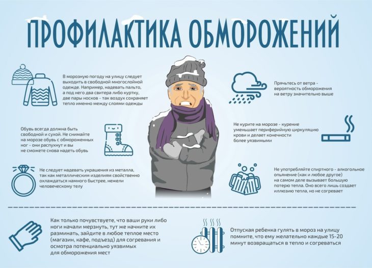 Как только на прогулке вы почувствовали переохлаждение или замерзание конечностей, необходимо как можно скорее зайти в любое теплое место: магазин, кафе, подъезд — для согревания и осмотра, потенциально уязвимых для отморожения мест.