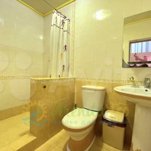 Уютный и достаточно просторный санузел – совмещены душ и туалет. Уверены, что внимание привлекут цвета, которые были выбраны для оформления помещения: преобладают розовый и голубой.