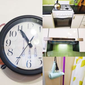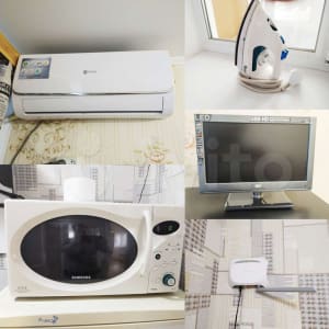 Бытовая техника: кондиционер, телевизор, холодильник, стиральная машинка, микроволновая печь, вытяжка, пылесос, фен.