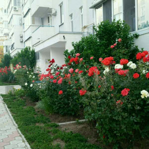 Территория огорожена, ухожена, много зелени, есть детская и спортивная площадки.
