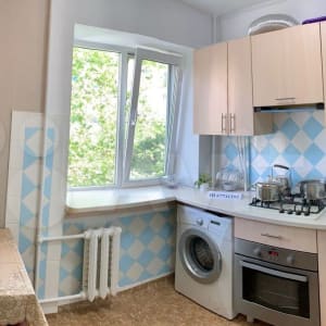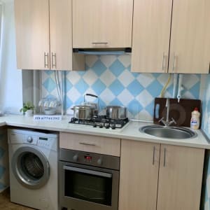 Кухня оборудованна всем необходимым для приготовления пищи: обеденный стол и стулья, газовая плита и духовка, посуда, чайник, тут же находится стиральная машинка, а холодильник находится в прихожей.